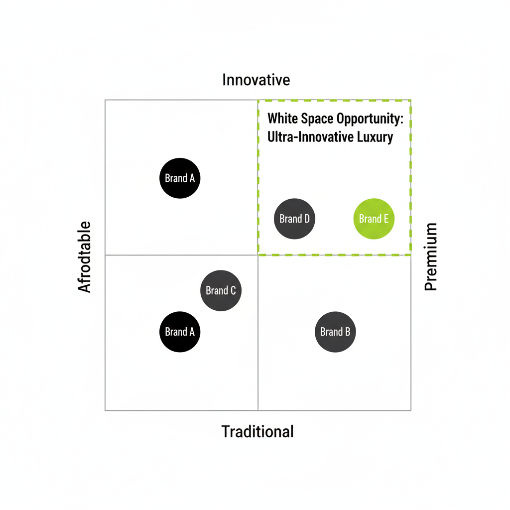 An empty space on your map doesn’t automatically mean opportunity. It might mean that position is undesirable to customers (they don’t value that combination of attributes based on consumer preferences), unprofitable to serve (margins don’t support the business model), or indefensible (competing brands can easily copy once you prove the market). Validate white space through three filters: Is it desirable? Is it defensible through your IP? Is it profitable?
