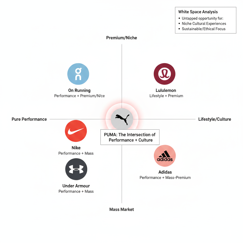 Good White Space: “Premium Performance with Cultural Credibility” (PUMA’s territory through strategic motorsport partnerships that took decades to build)