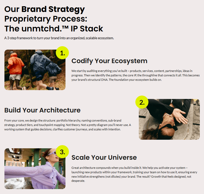 At unmtchd, we work with founders and brand leaders on comprehensive brand architecture that integrates IP thinking from the foundation. Our advisory services guide you through identifying, codifying, and scaling your brand IP as part of a holistic business strategy – not as a separate legal consideration.